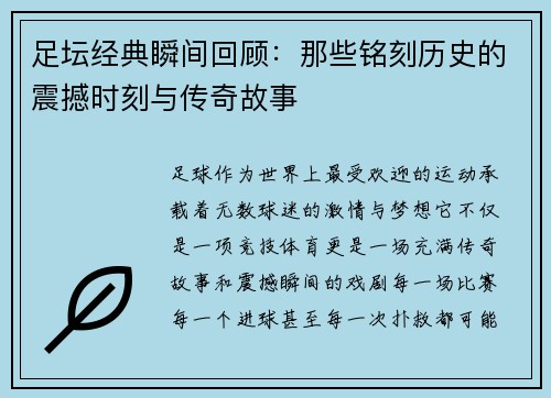 足球,作为世界上最受欢迎的运动,承载着无数球迷的激情与梦想。它不仅是一项竞技体育,更是一场充满传奇故事和震撼瞬间的戏剧。每一场比赛,每一个进球,甚至每一次扑救,都可能成为历史的一部分。本文将回顾足坛那...